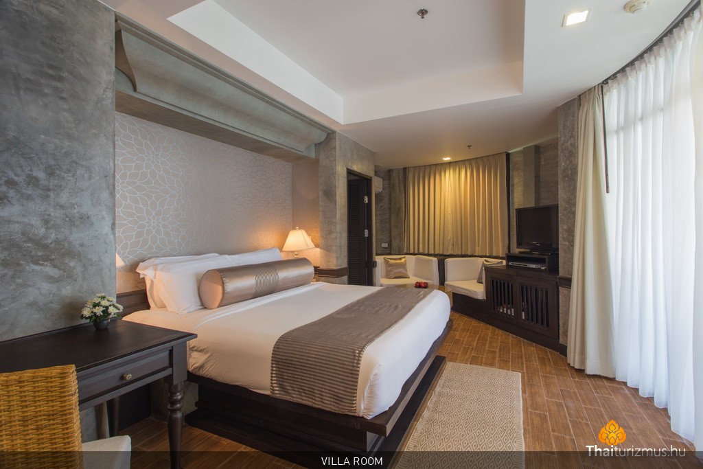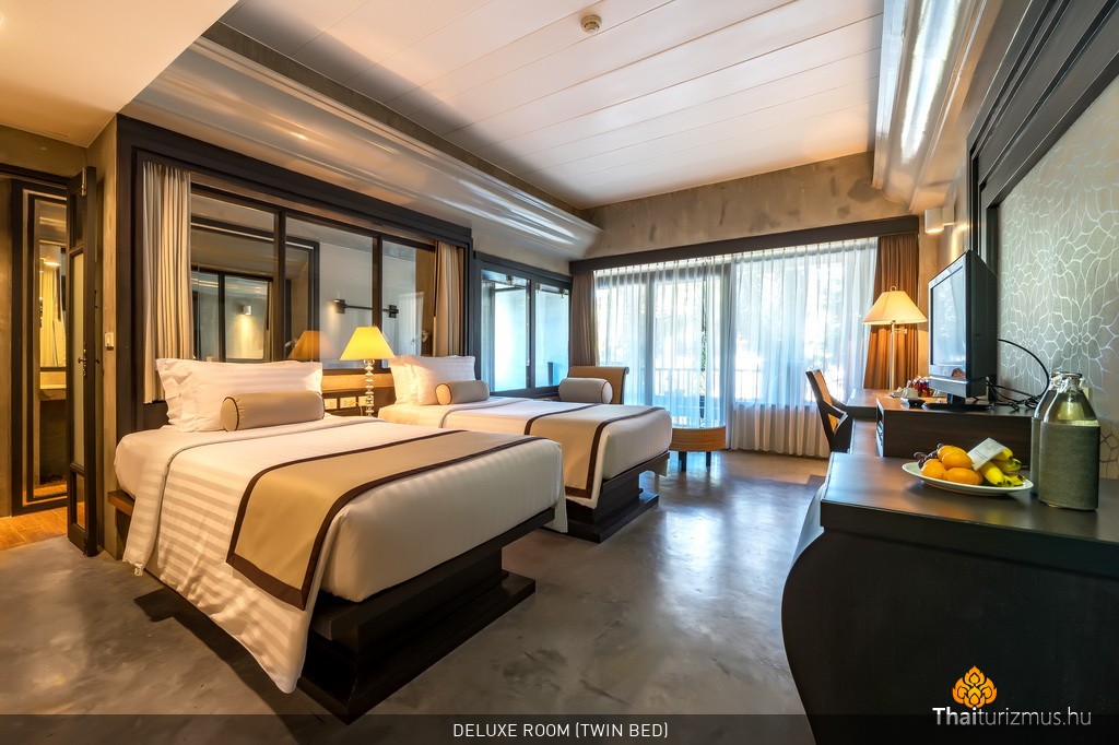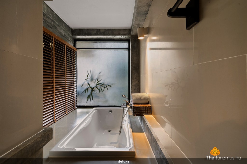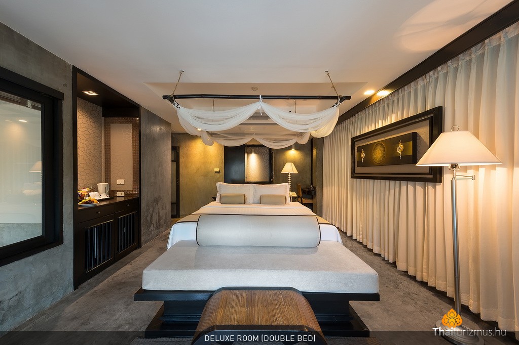 Deluxe szobák: Tágasak, egyedi tervezésű bútorokkal és privát erkéllyel, ahonnan a buja kertre vagy a medencére látni a 3 szintes főépületben helyezkednek el.