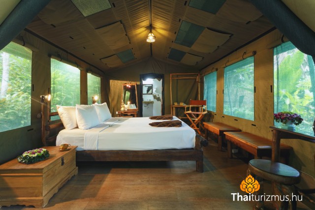 A természetközeli tevékenység után itt az ideje egy forró zuhanynak a luxus szafari sátor egyedi fürdőszobájában. Pihenés, élvezze a környező dzsungel borította hegyek panorámáját ez 100%-ban az igazi természet! Széles választékú koktélok, borok és szeszes italok széles választékát kínálja a "Dzsungel felfedező klubb bárja". A fakultatív esti szórakozási lehetőségek között szerepel egy film előadás, a helyi iskolások hagyományos thai táncbemutatója és főzési bemutató, ahol megtanulhatod, hogyan kell főzni, hogyan kell helyesen elkészíteni a thai specialitásokat. Este 20:00 órakor vacsoraidő van ezen az egyedülálló helyen, az esőerdő mellett, a hangok és a hangulat emlékezetessé teszik ezt a vacsorát.