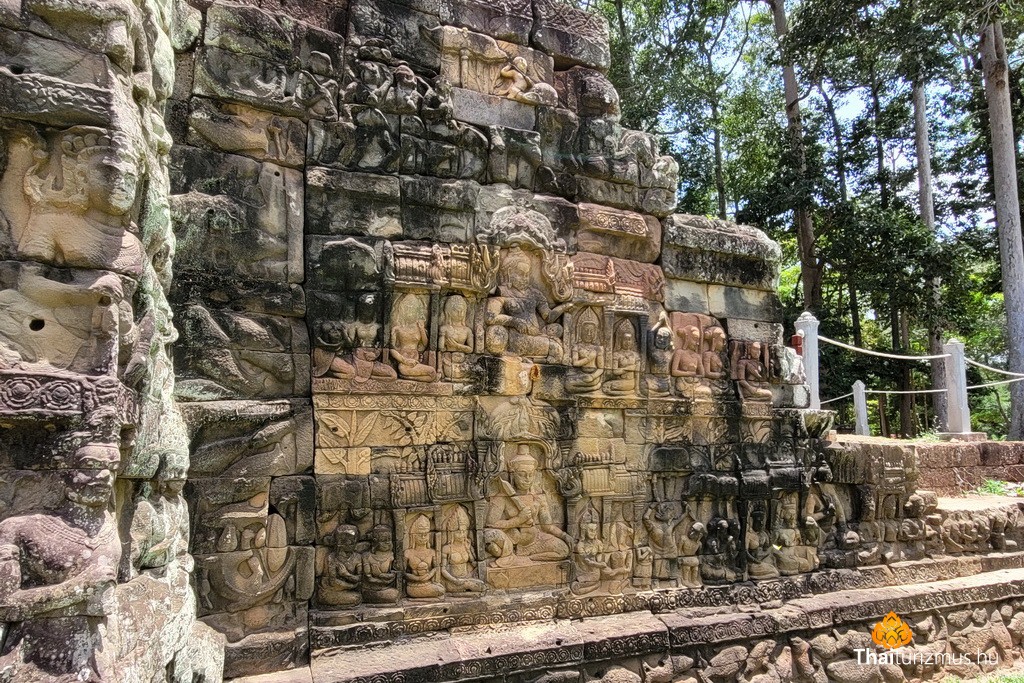 A templomtól tovább sétálva a következő épület maradvány az Elefántok Terasza. A teraszt Angkor királya, VII. Dzsajavármán emelvényként használta, ahonnan győztesen visszatérő seregét szemlélhette. A Phimeanakas palotához volt csatolva, amelyből csak néhány rom maradt meg. A 350 méter hosszú Elefántok teraszát a nyilvános szertartásokon óriási szemlélőszékként használták, és a király nagy audienciacsarnokának alapjául szolgált. Öt előépítménye van, amelyek a központi tér felé nyúlnak - három a közepén és egy-egy a két végén. A támfal középső részét életnagyságú garudák és oroszlánok díszítik; a két vége felé pedig a híres elefántparádé két része látható, khmer mahoutjaikkal együtt.