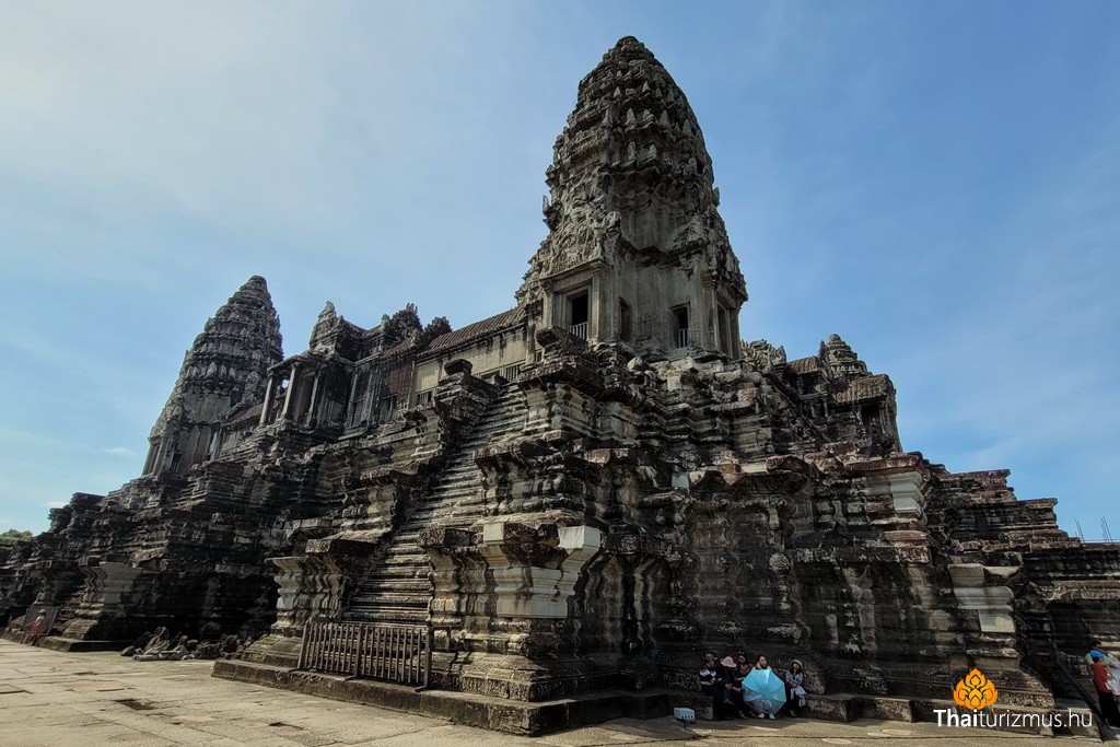 A kirándulás utolsó állomása és a nap fénypontja, Angkor Wat megtekintése mely a legnagyobb templom komplexum, területe 81 hektár. Jellegzetes öt tornya Kambodzsa címeres zászlóján is látható. Ez a 12. századi remekmű művészettörténészek szerint az első és legjobb példája a klasszikus Khmer művészetnek és építészetnek. Angkor Wat öt tornya Meru öt csúcsát jelképezi - az azt bekerítő fal képviseli a világ peremén levő hegyeket, az azt körülvevő vizesárok pedig az óceánt. Angkor wat további érdekessége, hogy a korábbi templomoktól eltérően nem keleti, hanem nyugati tájolású. Az épület csodálatosan megmunkált homokkőből épült, és néhány nem látható, belső épületelemhez lateritet alkalmaztak. A munkálatokhoz szükséges homokkőtömböket a csatornákon szállították Angkorba.